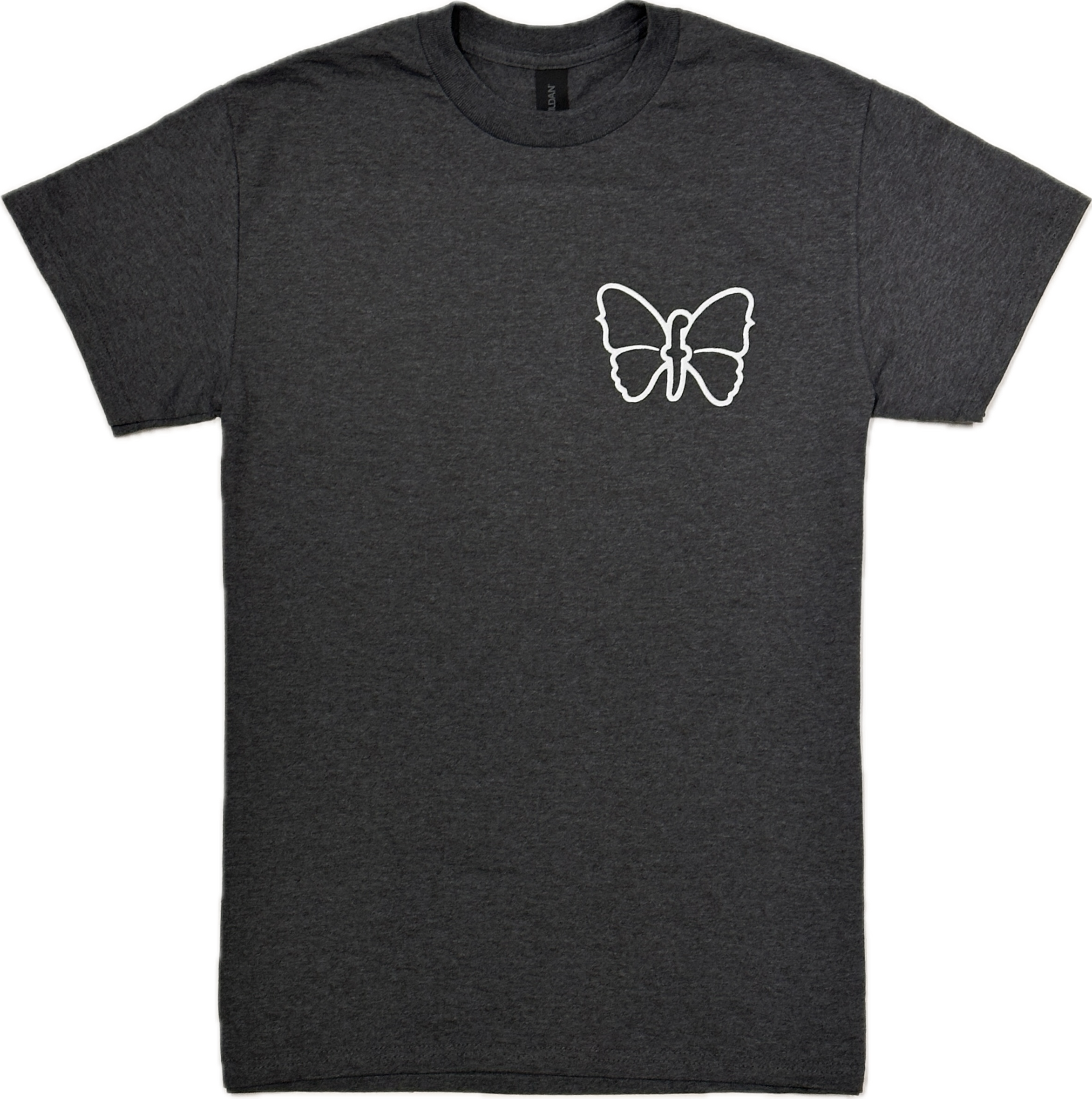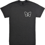 Heather Gray Heavy Cotton™ short sleeve T-Shirt with white butterfly on front and website on back. Fits true to size.