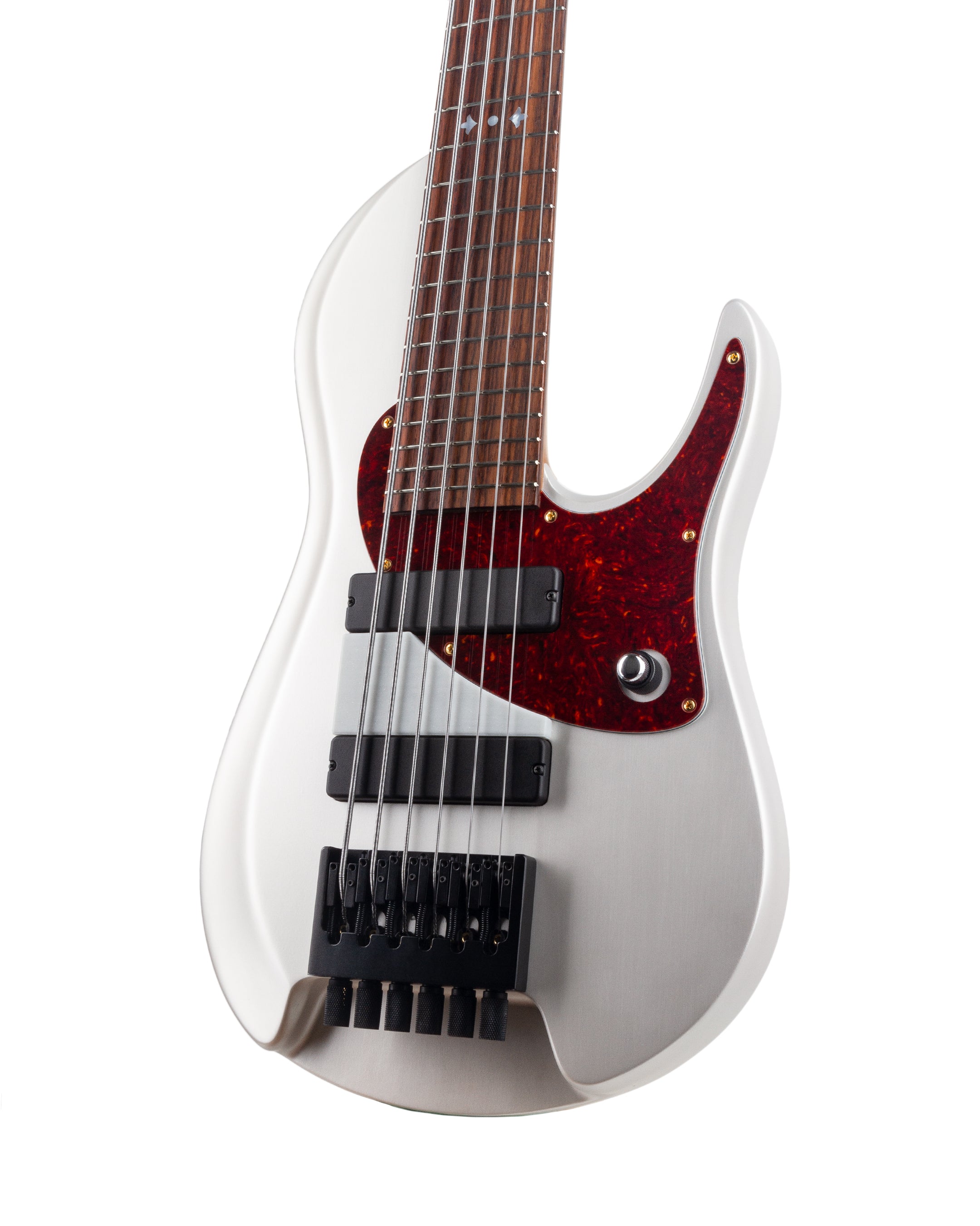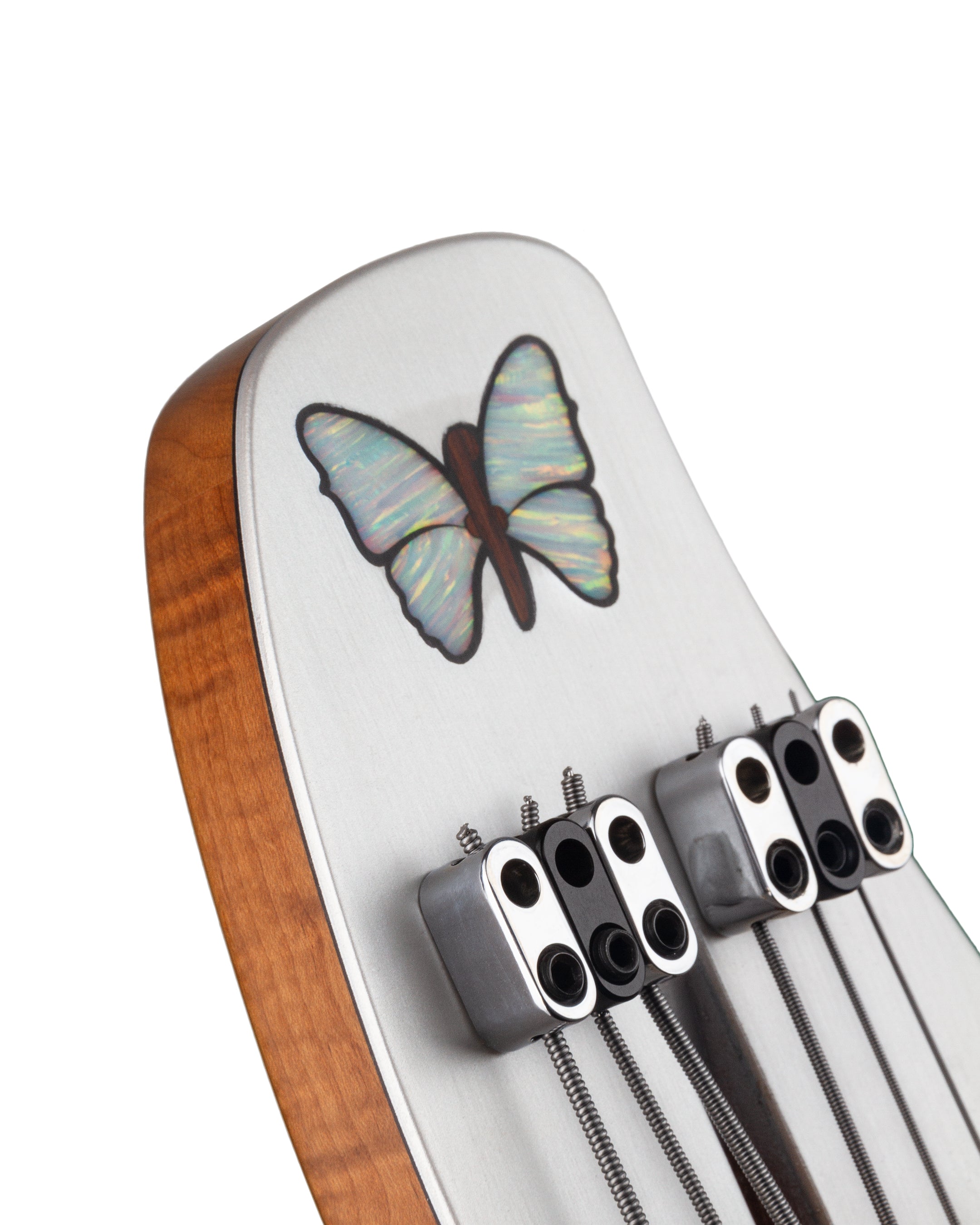 The Mini MB Presentation is Fodera’s first 31” (short) scale Presentation model. Its compact body style is an adaptation of the AJ Presentation shape modified to fit Mike’s needs as a player. It also incorporates a brand new angled back mini headstock design that allows the truss rod to be easily accessed or removed if necessary. New, individual, string locks on the headstock allow for easy string changing and tuning stability.
