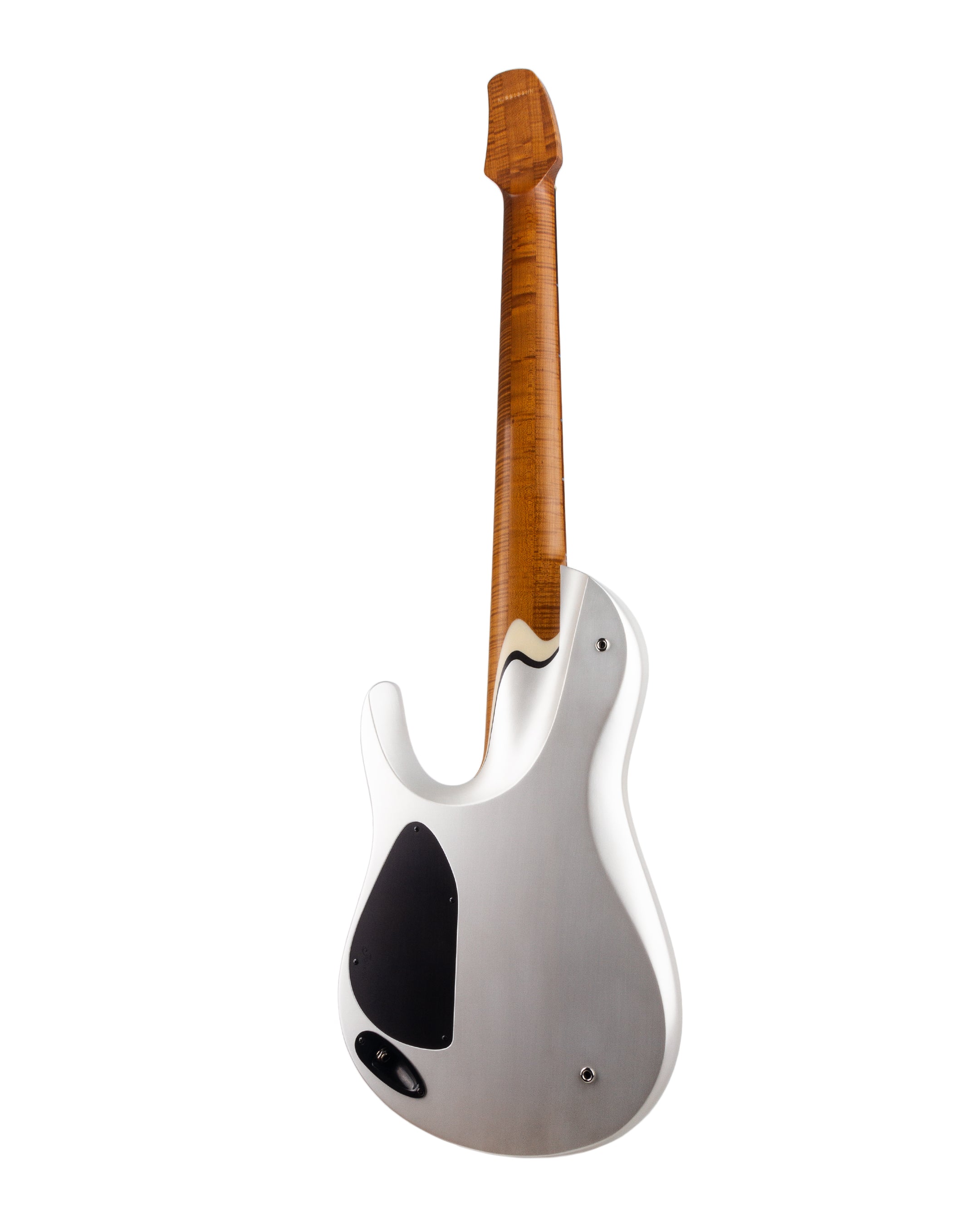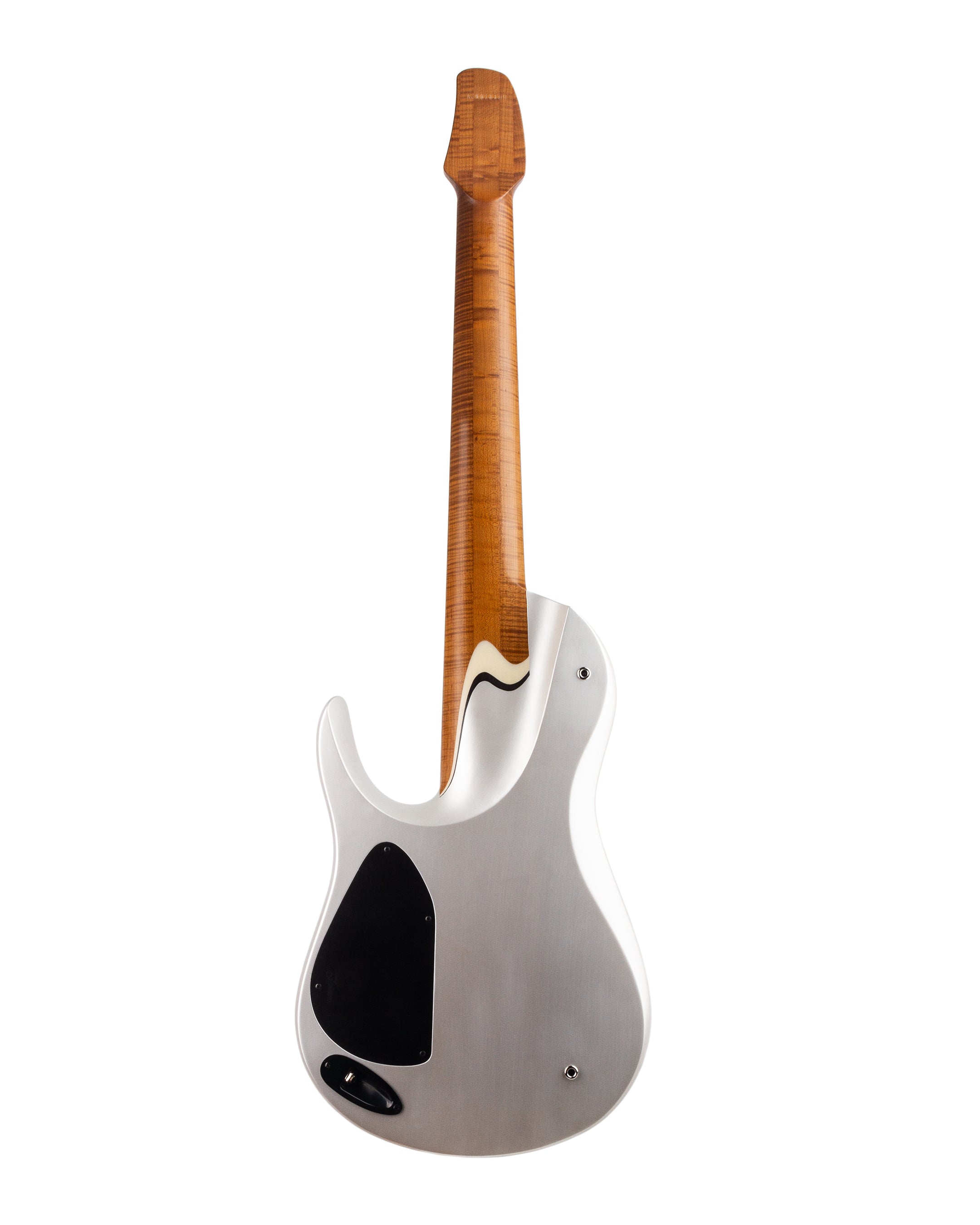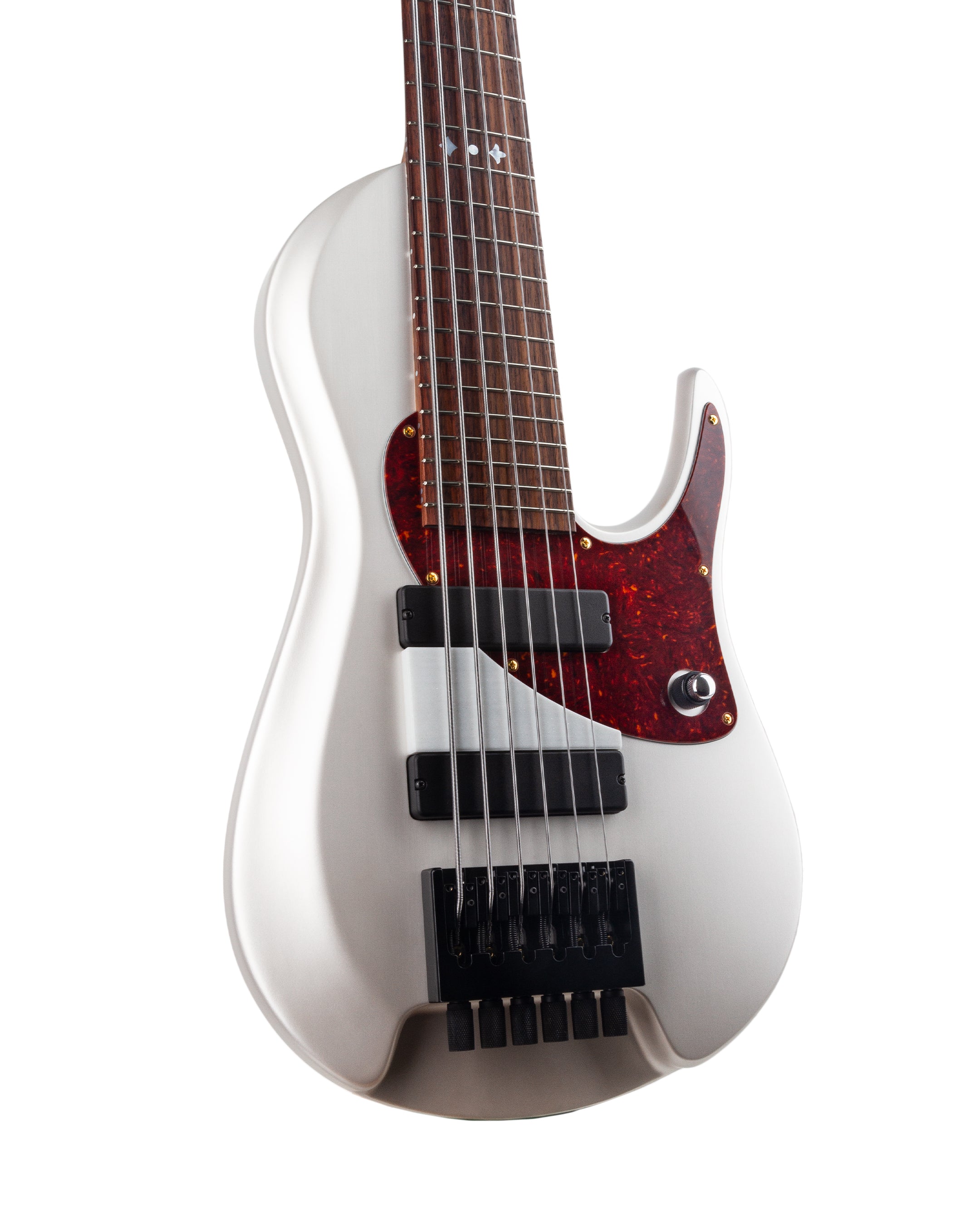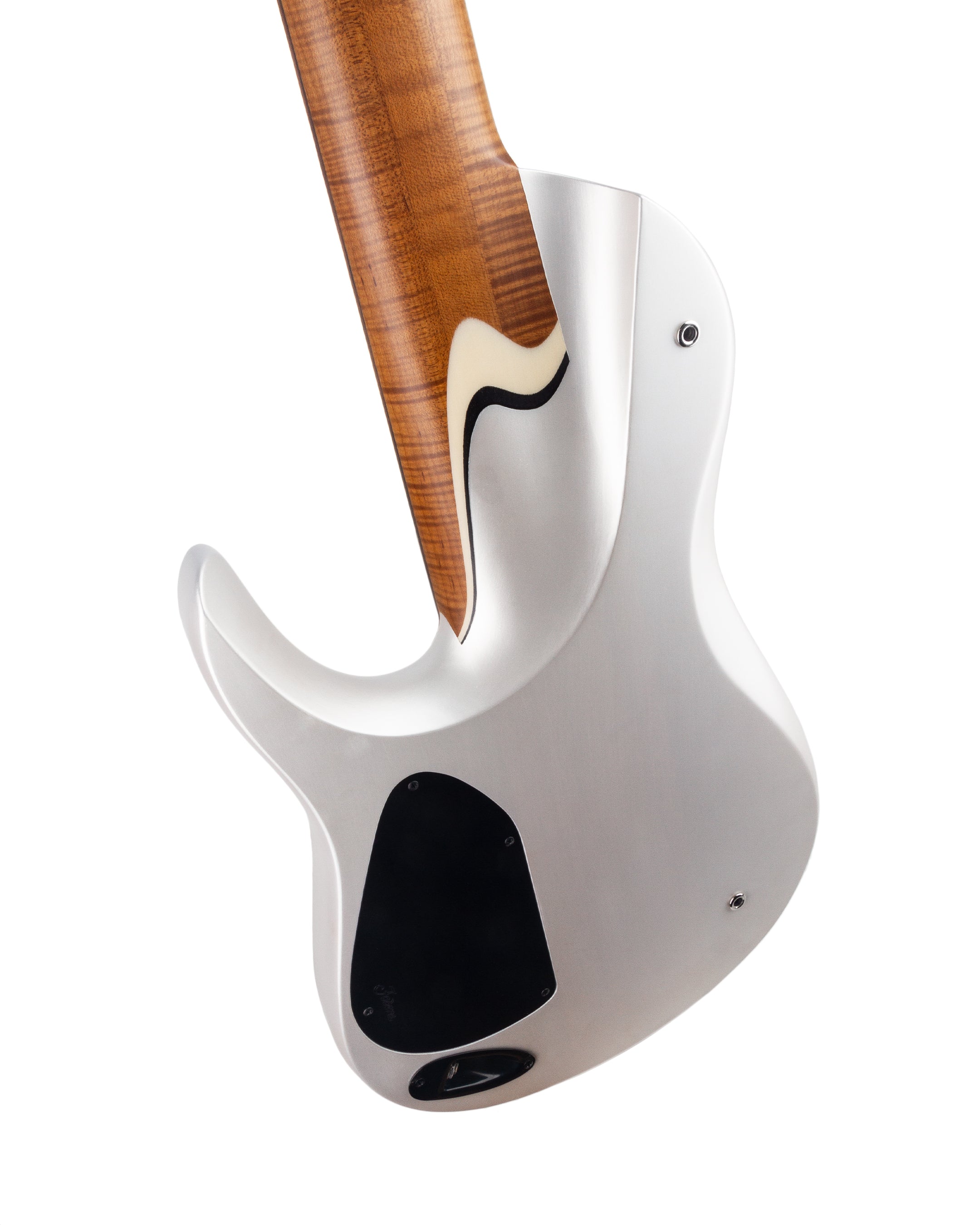 It features a 16.5 mm spaced bridge that sits on a carved out ‘shelf’ and rear-mounted strap locks and jack to support the streamlined appearance that Mike was looking for. The Mini MB also features a 3D printed ramp that elegantly contours to its tortoiseshell pickguard, a pair of Fodera/Duncan Dual Coil pickups, and passive electronics with a stacked volume-volume control.