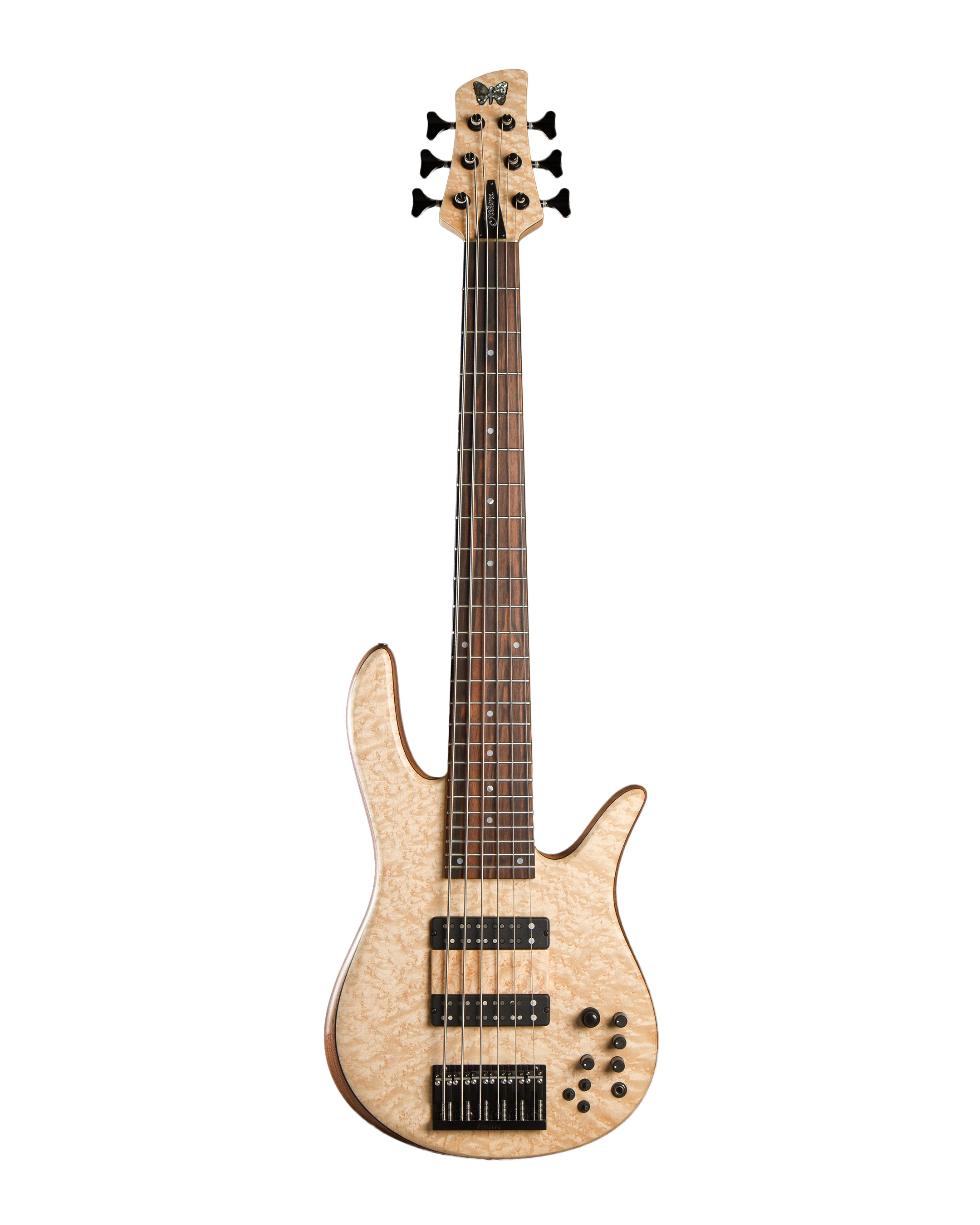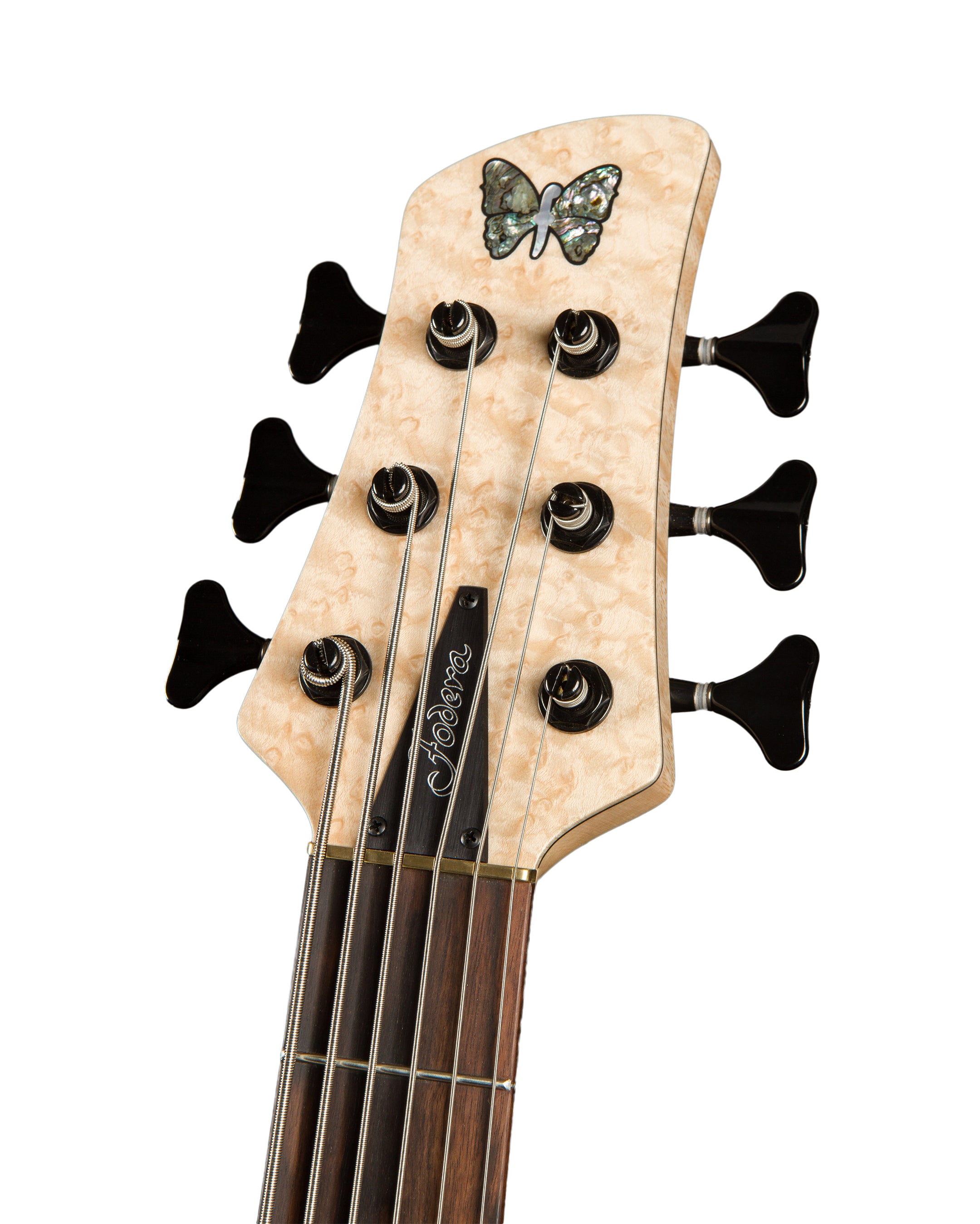 Tony has always preferred his Foderas to be as compact as possible and this Monarch 6 is no exception. With its 33″ scale and 17.5mm bridge spacing, the Tony Grey Signature Monarch is our most compact regularly built six-string instrument. The body, made of Walnut, is capped with a solid Birdseye Maple top, three-piece Hard Rock Maple neck, a Flame Maple Tone Block and a Macassar Ebony fingerboard to generate the warm yet clean, bright tone that helps Tony to define his signature sound. A pair of Fodera / Seymour Duncan Dual Coil Pickups and a ramp complete the model that proudly bears his name.