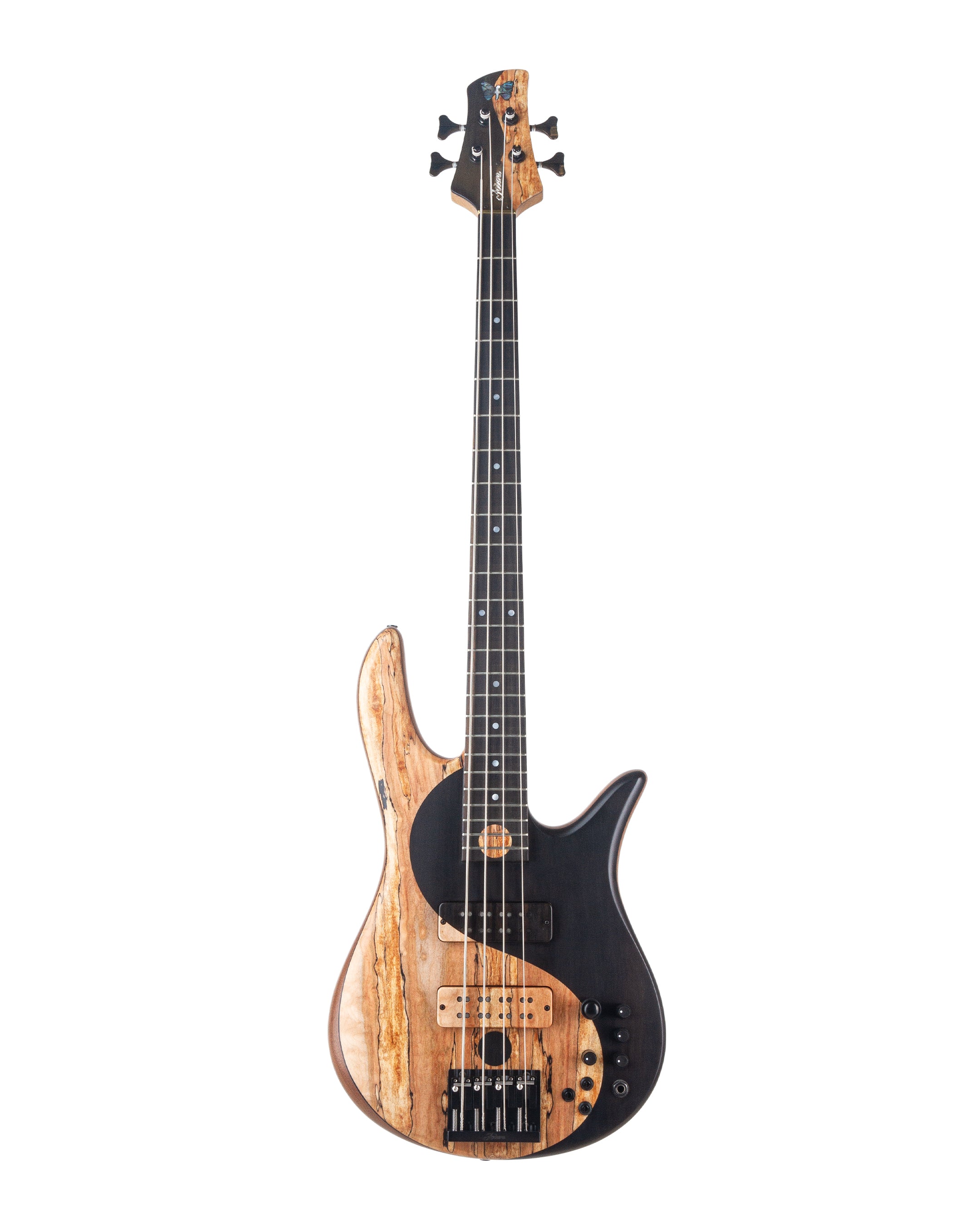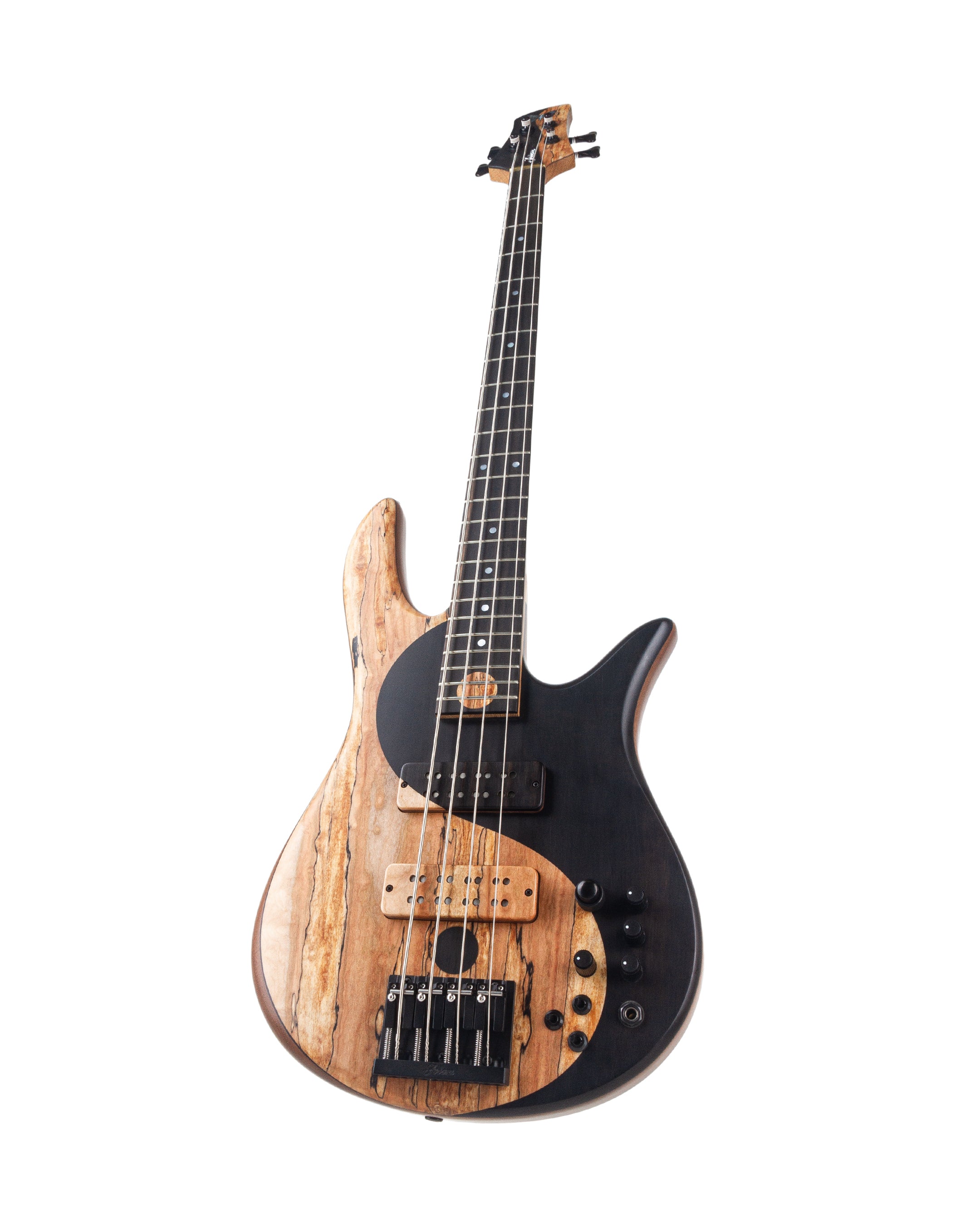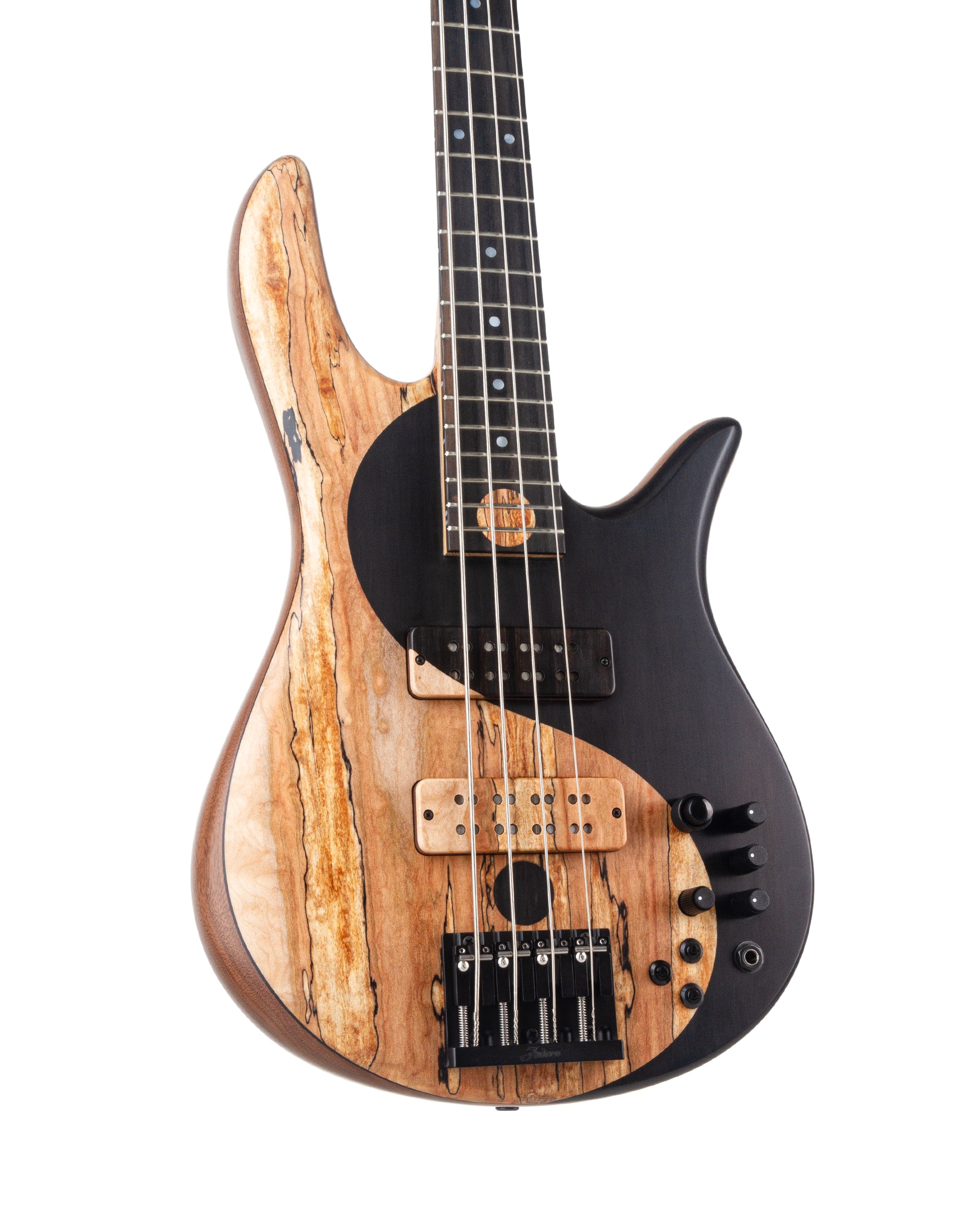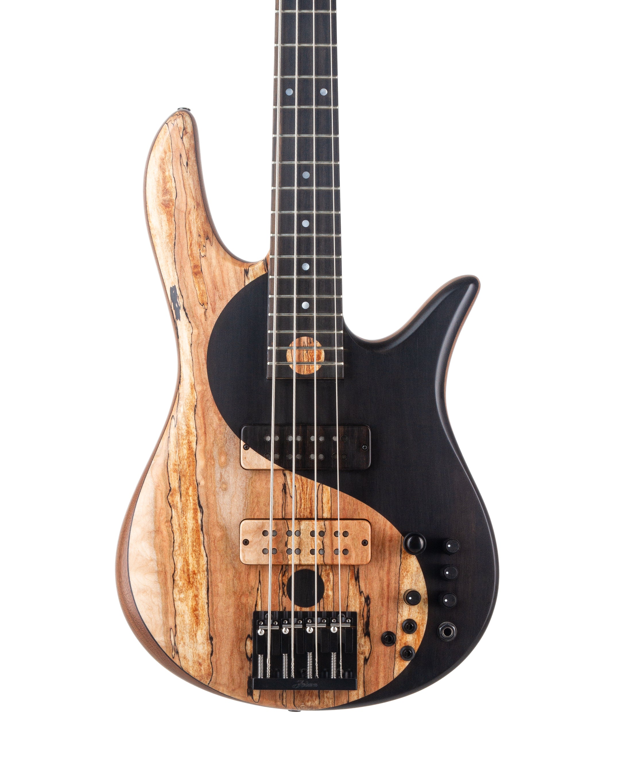 The top for Victor’s new Yin Yang features hand-joined Spalted Maple and Ebony. The Ebony fingerboard is beautifully adorned with Mother-of-Pearl dot inlays and a large Spalted Maple dot centered between the 23rd and 24th fret completing the Yin Yang design. The instrument’s Dovetail neck joint provides the punch and direct response of a bolt-on while allowing for uninhibited access to the upper frets.