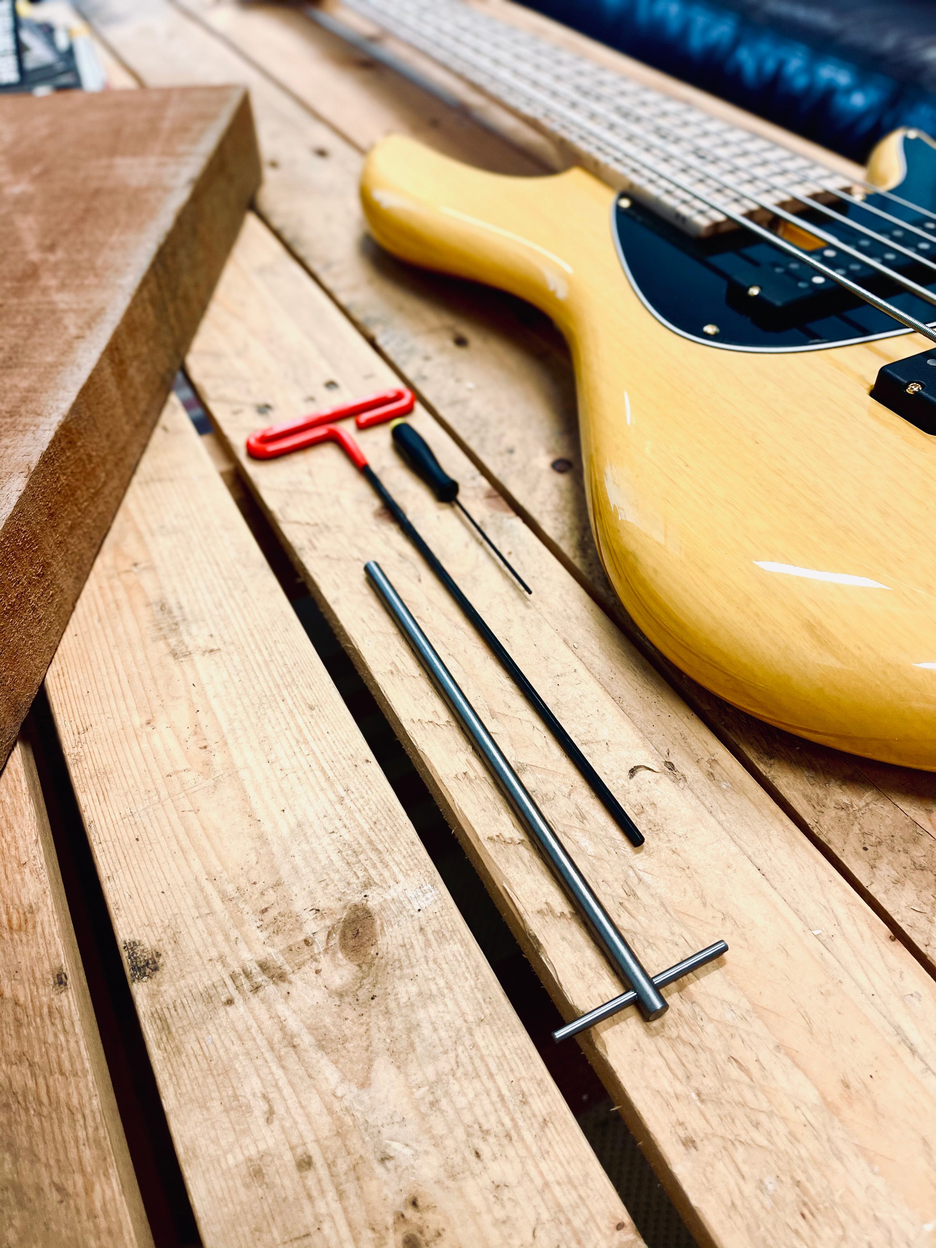 Our legacy tool kit for any of our (non-headless) Custom Series instruments that were produced prior to March 2025 with a 1/8" truss rod nut. This includes allen and T-handle keys for adjusting the bridge and truss rod as well as our truss rod puller to remove / reverse your truss rod.