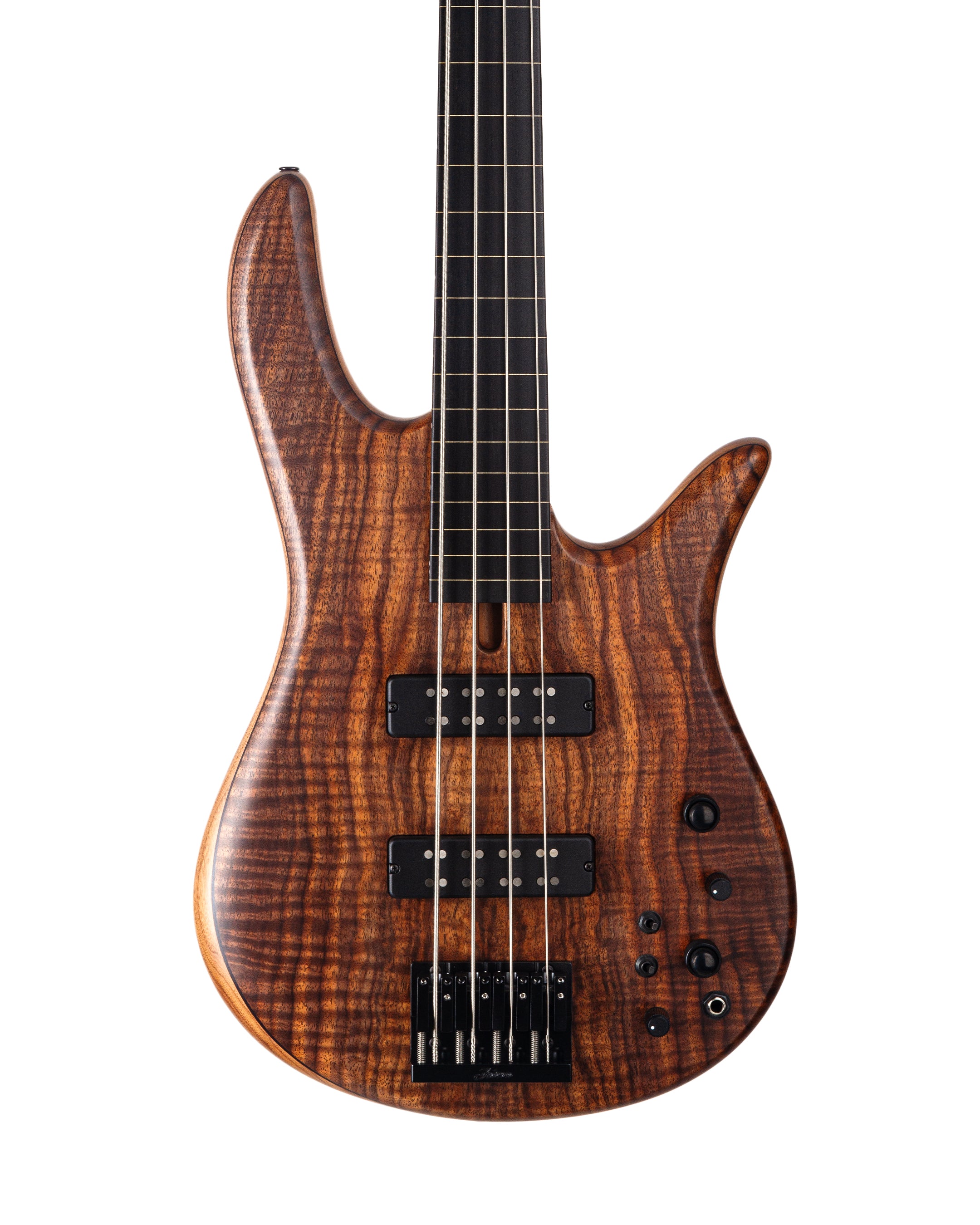 The Monarch Standard Fretless blends the aesthetics, tone, playability and pro-player reliability bass players have come to expect from Fodera. Based on our acclaimed Monarch Standard, our Monarch Standard Fretless bass guitar features a unique tone-wood combination that delivers an incredibly rich, organic, and nuanced tone. The walnut body provides a warm yet punchy sound that supports low frequencies very well and has a slightly compressed midrange. We then matched it with a hand carved, 3-piece roasted maple neck and a lined ebony fingerboard that results is a focused and smooth, yet beautifully articulate fretless tone.