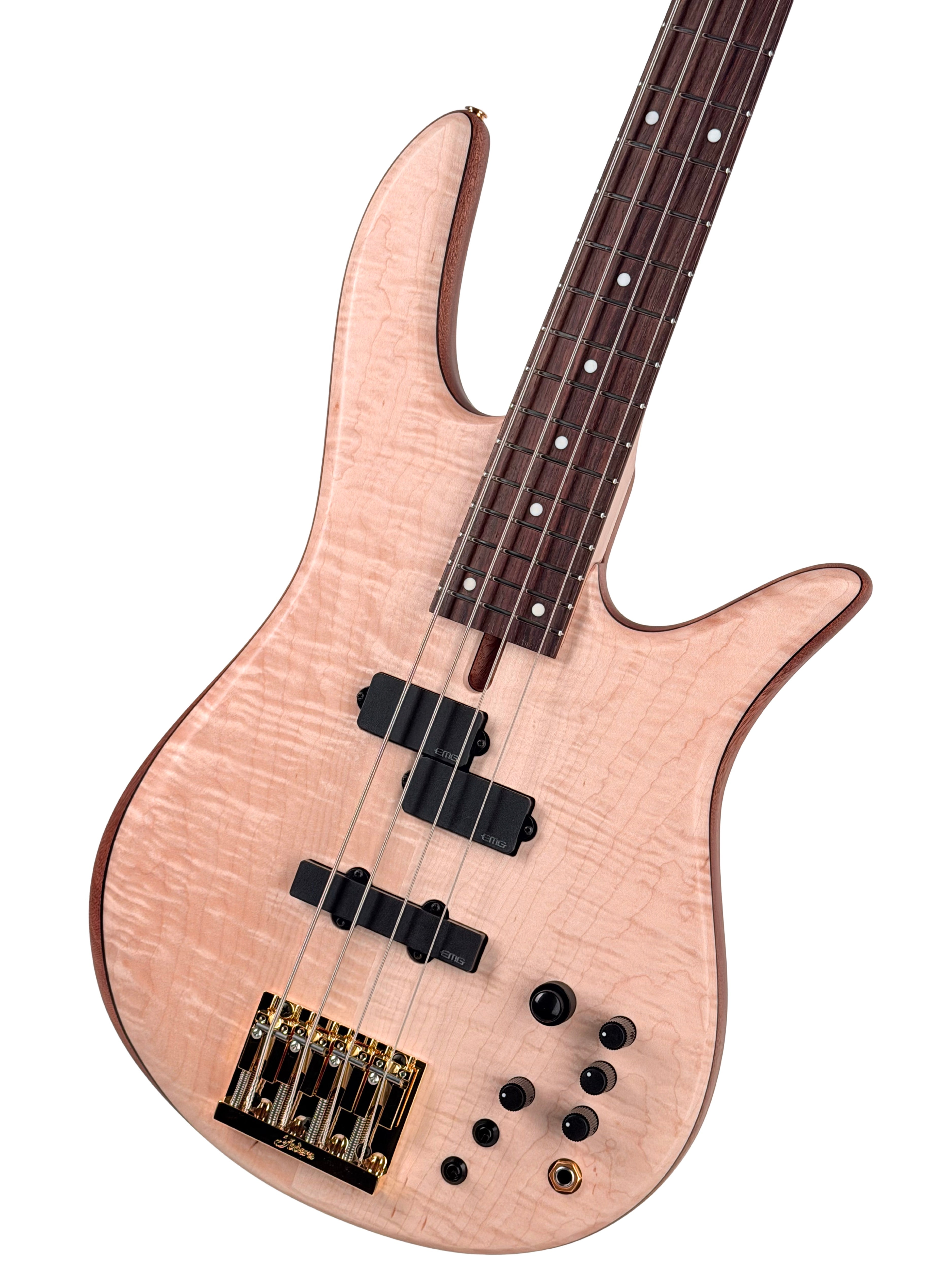 We kept the classic 3-piece Maple neck with an Indian Rosewood fingerboard and clay dots. It features a 34-inch scale, 24 frets, and 19-millimeter spacing, so it feels fast, familiar, and incredibly comfortable. Under the hood, you’ve got the EMG P/J pickups in Victor’s exact spacing, just like the original. And powering it all is our Fodera x Trickfish Custom 3-Band Preamp— giving you musical, studio-grade tone shaping in any situation.